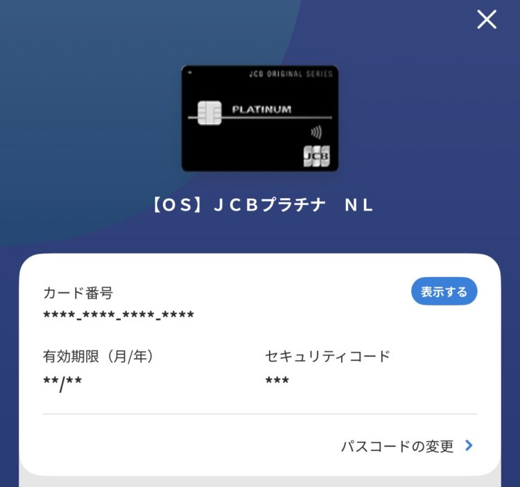 表示するを押すと、カード番号・有効期限・セキュリティコードが現れます。